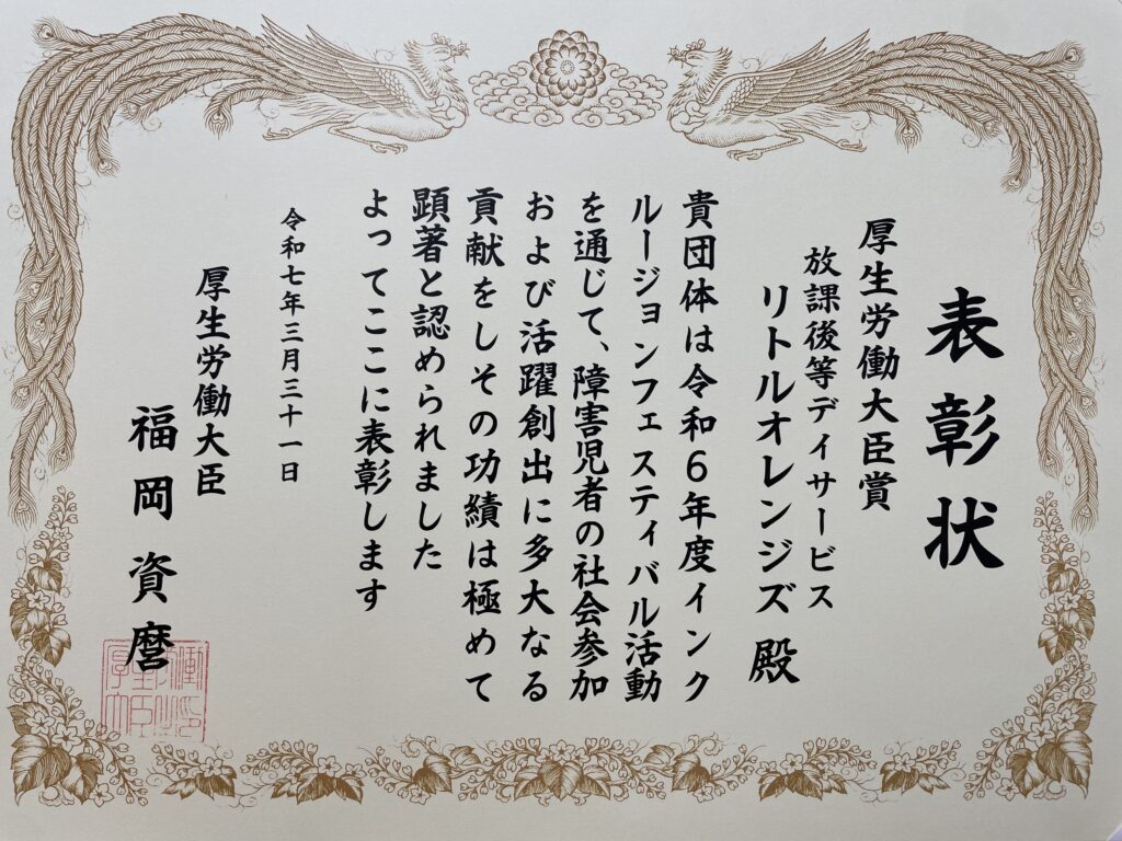 特定非営利活動法人リトルオレンジズが運営する放課後等デイサービス「リトルオレンジズ」の活動が大きく評価され厚生労働大臣賞を受賞しました。
