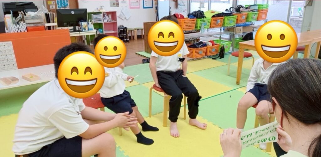 ゲームが始まるとみんな順番やルールを意識しながら、お友達を繰り返し呼び合ったり、順番を忘れている子がいれば お隣同士でやさしく声掛けをしてあげたり、子どもたちはニコニコ笑顔で上手にテンポよく楽しんでくれました!